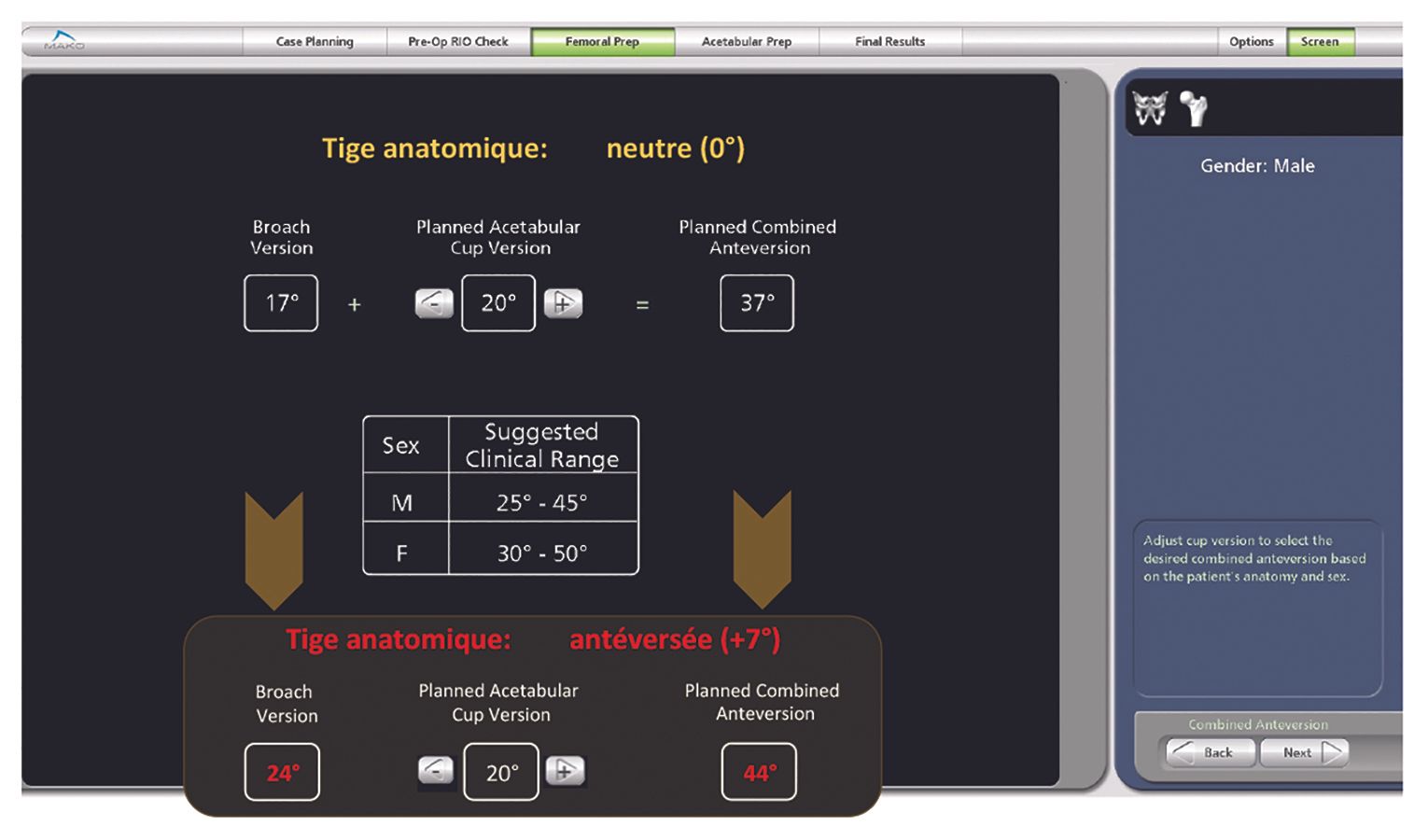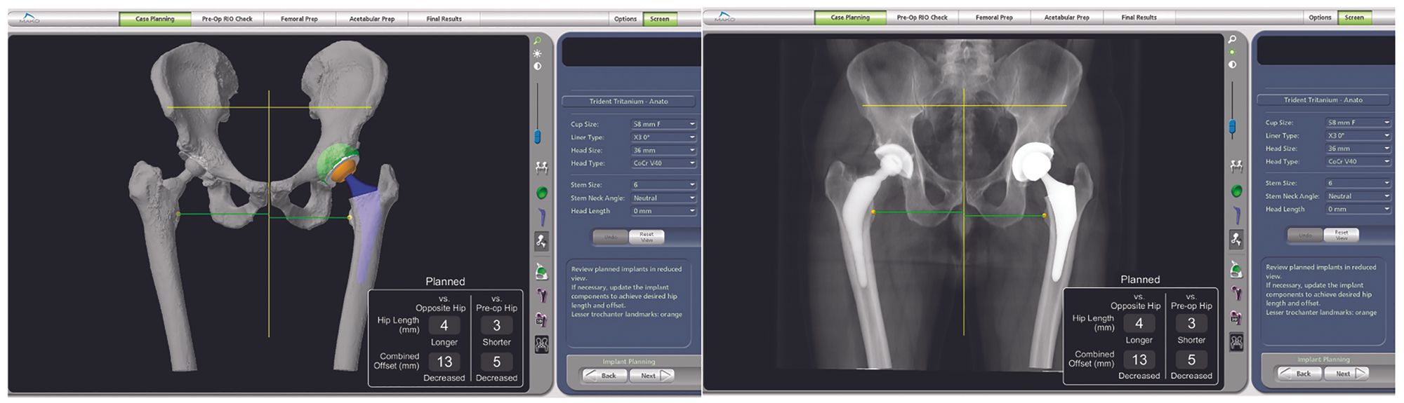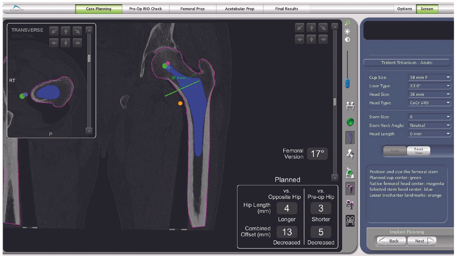 Once the femur is prepared, stem version, lateral shift and leg length data are collected from either the trial components or the final implant and may be used to make adjustments in head length by editing the plan and checking the data using intraoperative data acquisition.