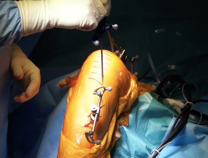 The first stage is to position the femoral and tibial tracking arrays (for a patellofemoral arthroplasty, only the femoral tracker is needed), which are usually placed percutaneously onto the tibia (Fig. 3) and onto the femur via a minimal subvastus portal or through the quadriceps. The trackers must remain visible throughout the procedure, including at both ends of the knee range of motion.