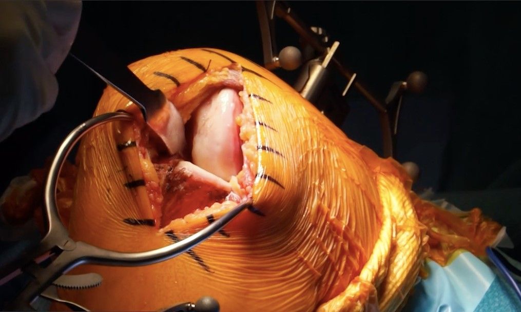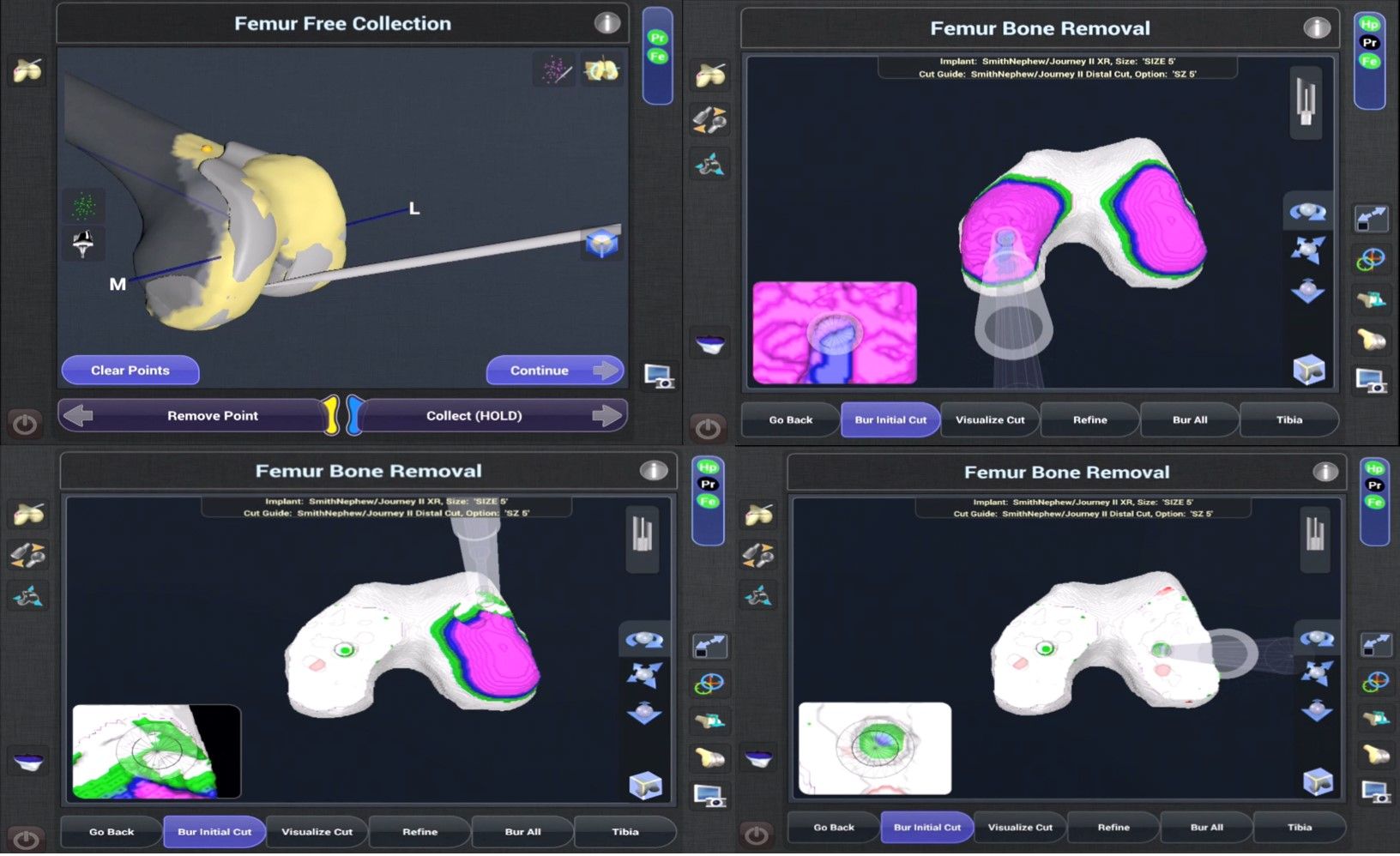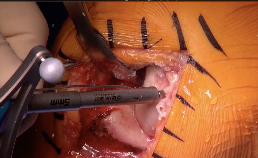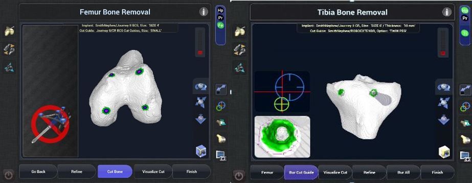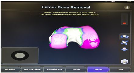 The surgeon has complete freedom of movement, and the robotic system only retracts if the bur moves outside the planned area. The knee should be gradually moved into hyperflexion to access the posterior most part of the femur. The cylindrical burs are quick and efficient, and are especially effective at accessing the posterior condyle.