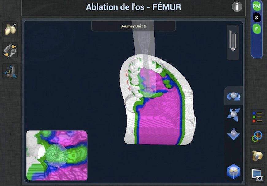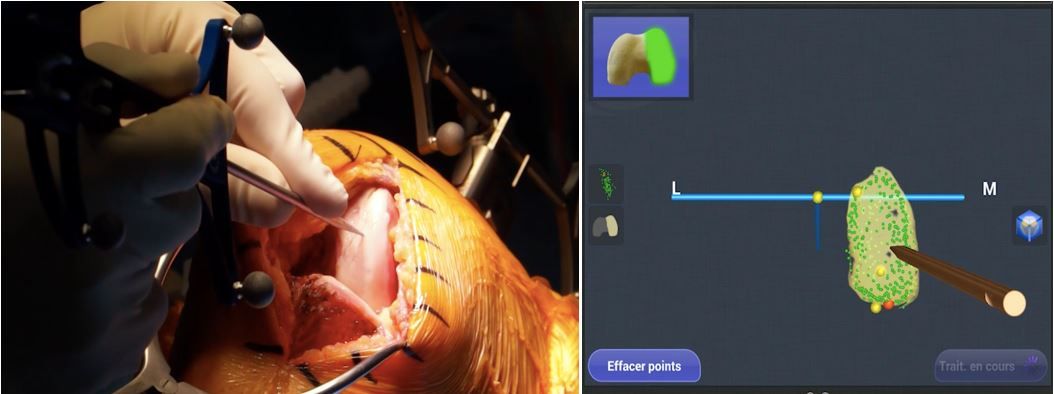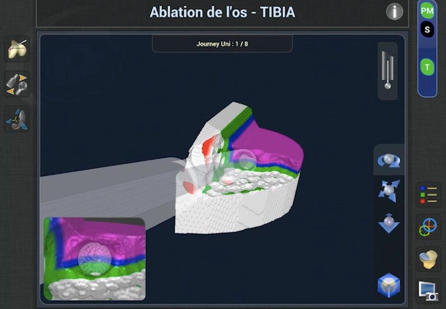 Once the plan is validated, the bone surfaces can be prepared. We usually begin with the femur, which is easier to access. However, it is also possible to start with the tibia. The handpiece uses an automatic feedback system to prevent any burring outside the target area. The bur retracts if it exits this zone, making it impossible to remove any bone from elsewhere by mistake (Fig. 8).