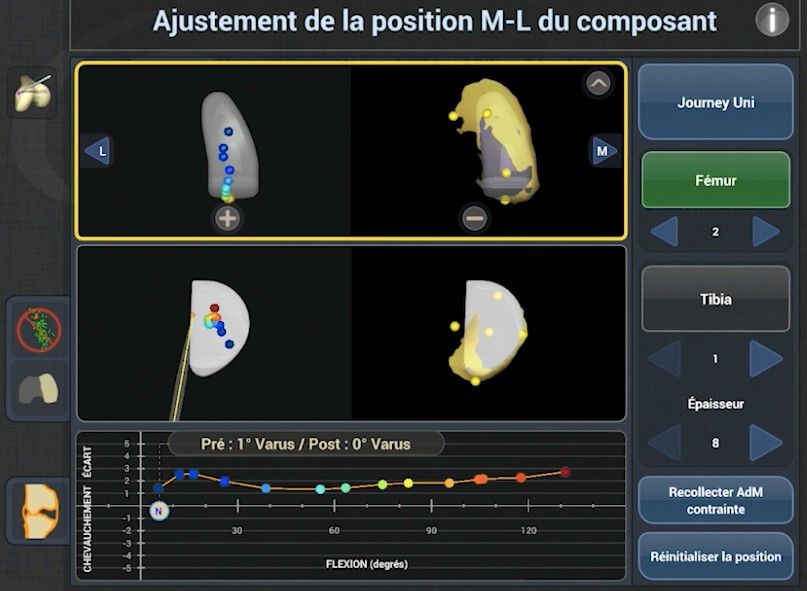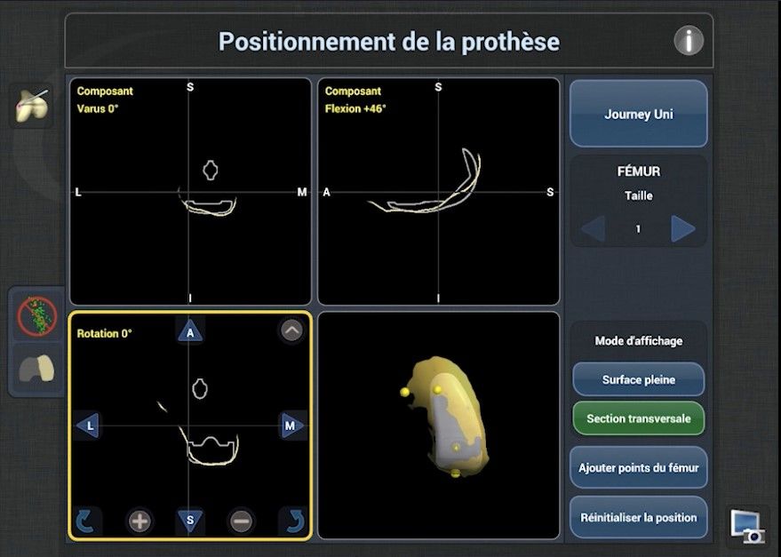 Planning is one of the most important stages of this robotic system because it produces a real dynamic map of the joint, taking into account the size of the gap. The first step is to select the size of the femoral component, although this can be changed at any time during planning. Next, the surgeon determines the desired placement of the femoral component in all three planes of view. The monitor displays four primary viewscreens to show the exact positioning of the component against the shape of the femoral condyle recorded in the previous stage. Using the touchscreen, the surgeon can manipulate a three-dimensional (3D) view of the condyle and the proposed component, to visualise the exact final position. The angles of the femoral component can be seen at all times: varus/valgus, flexion, rotation (Fig. 6). The goal is to cover as much of the bone surface as possible while retaining the height of the joint space and avoiding any major impingement of the tibial spines.