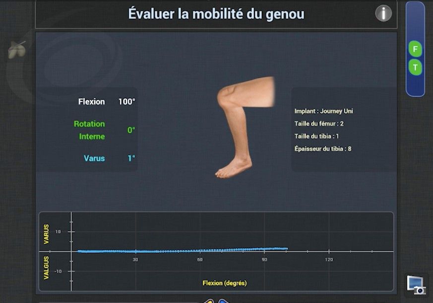 Next, we visualise the outcome of the planning in terms of angular correction (preoperative vs. postoperative) between 0° and 120° flexion. At this point, we can adjust the positioning of both the tibial component (varus/valgus, slope, rotation, cut height) and the femoral component (varus/valgus, flexion, rotation, cut height) and generate an instant simulation of how the adjustments will affect the final angular correction. This simulation is based on the static data collections as well as the initial dynamic data, providing the ability to balance the gap throughout flexion.
