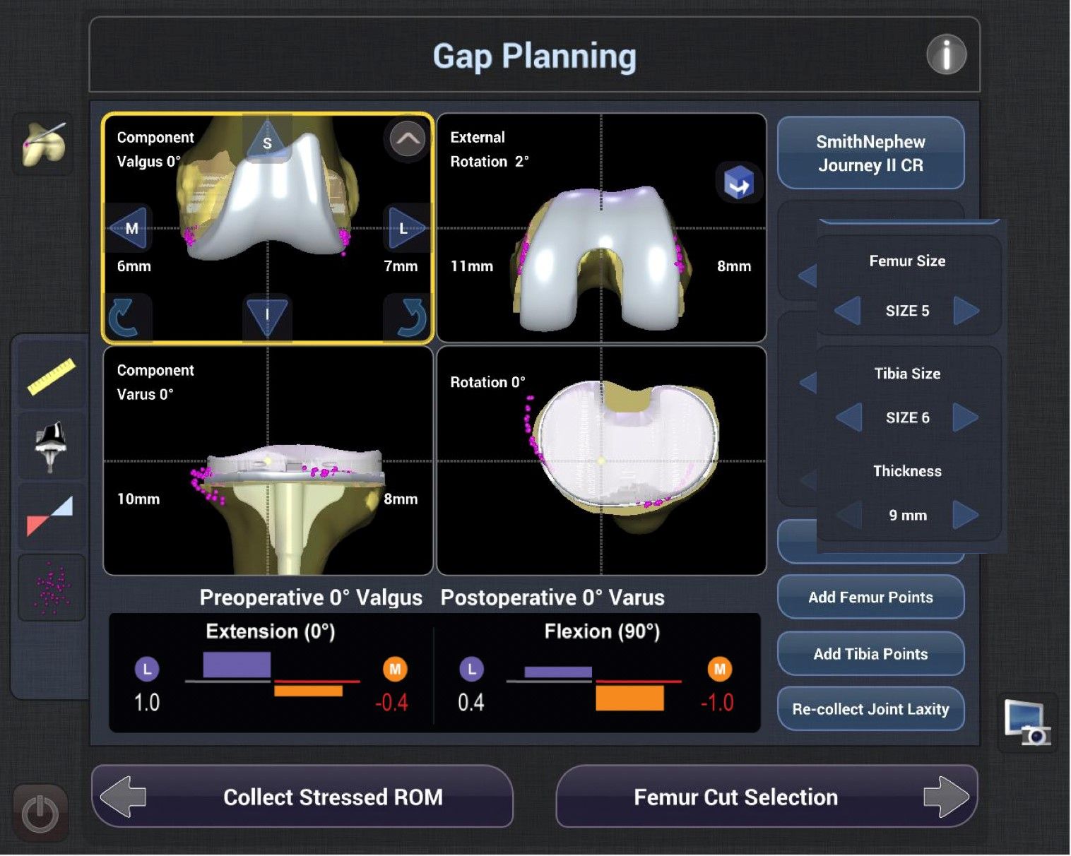 The surgeon can navigate between the various screens of the planning stage. Once the desired outcome is obtained, the final selection is validated.