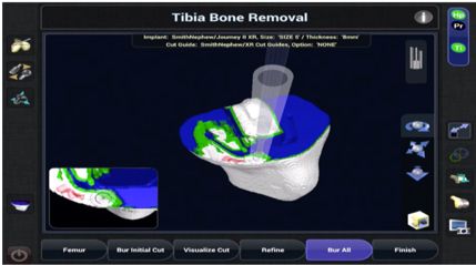 Once the femur has been prepared, the same visual planning control is used for the tibia before burring can begin. Start with the most anterior part of the tibia and gradually move across the whole of the planned surface. After burring, a rasp can be used to refine the bone cuts, smooth any bumps and finalize the angles. The meniscus can now be accessed easily and should be removed completely. The final stage is to burr the anchor posts on the femoral implant using the visual planning guide on the screen.