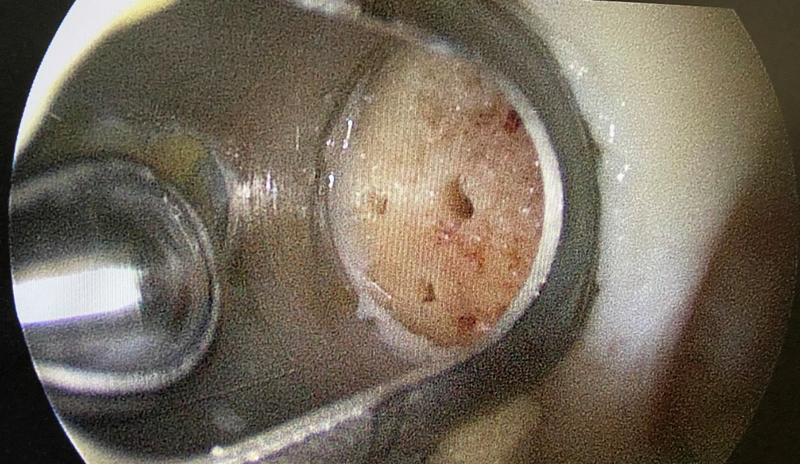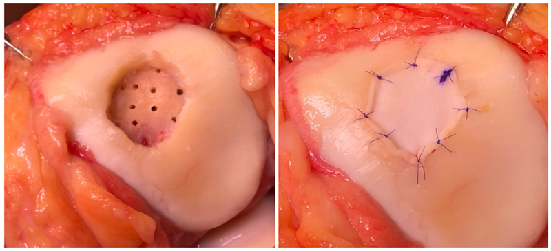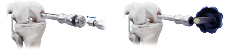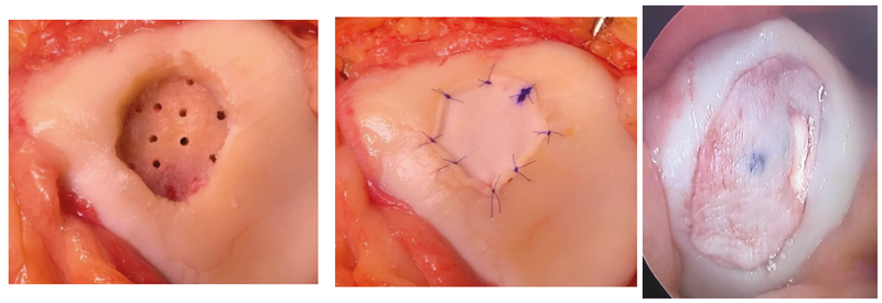 The OCT cylinder should line the defect without steps. It is therefore advisable to subject the surface finish of the defect to be treated and the depth of its size to an exact assessment before harvesting the donor cylinder. In practice, the surface curvature of the transplant can no longer be changed after harvesting. Furthermore, a cylinder that has been harvested too short also makes reconstruction more difficult. There are several hollow punches or burrs available for harvesting, ideally with finely graded depth and rotation markers. However, the defect size to be repaired should be limited to a maximum size of 1.5 cm2 and designed for no more than two OCT cylinders bearing in mind the resulting harvesting defects. (Fig. 16). In easily accessible areas the respective punches can be used to potentially treat the defect by arthroscopy or via mini-open arthrotomy (Fig. 17).