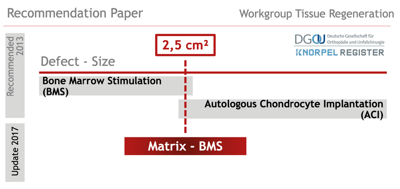 The growing study data provides now sufficient evidence for the superiority of M-BMS compared to Mfx surgery (also due to the pressure caused by non-availability of M-ACT). This recommendation was also included in the 2018 consensus paper of the cartilage therapy working group of the DKOU (German Conference for Orthopaedics and Trauma Surgery) [17] (Fig 5). This consensus paper also listed and compared the various new biomaterials of the M-BMS procedures.