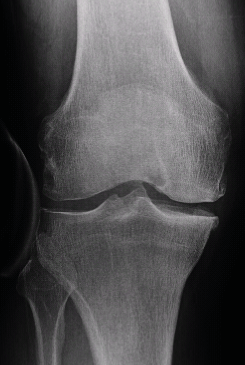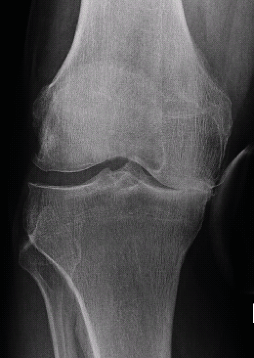 Radiographic analysis requires a weight-bearing full leg and lateral knee joint x-ray and a standard axial image of the patella. In addition, the extent of the narrowing of the joint space in the affected joint compartment should be assessed with a Rosenberg view (p.a. radiograph with weight-bearing and 45 degrees of flexion) or stress x-rays with varus/valgus stress. Since large numbers of unicondylar knee replacements are performed in our hospital, stress radiographs are standard for any unicompartmental OA requiring surgical treatment. The extent of the joint collapse and the stability of the joint can be diagnosed by these radiographs (Fig. 6, 7).