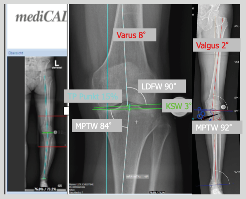 The deformity analysis of the full radiograph with the relevant measurements according to Dror-Paley (weight bearing line, mechanical axis, LDFA and MPTA) as well as the assessment of the joint line obliquity (JLO) and joint line convergence angle (JLCA) are of central importance. The planning for realignment osteotomy is standardized with an appropriate digital planning tool (e.g. mediCAD®). (Fig. 8)