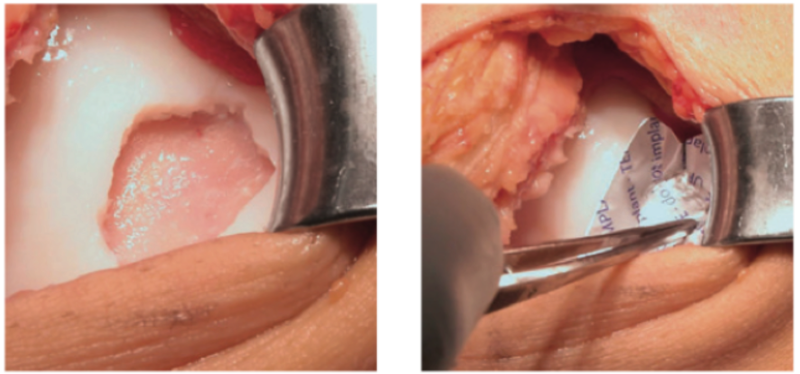 The AMIC procedure has been used in our hospital for many years. In general, a diagnostic arthroscopy is performed first with treatment of the comorbidities (meniscus, arthrolysis, etc.). The indication is verified and documented. Then the osteotomy is performed. For the cartilage treatment the knee joint has previously been subjected to a short arthrotomy as a standard treatment. By now, arthroscopy instruments are available for some biomaterials. During preparation, the defect is stabilized at the margins or punched by arthroscopy and the base of the defect is debrided in stages and the subchondral layer is cleaned up. At this point, inferior subchondral bone can still be additively augmented with autologous spongiosa. During an osteotomy the spongiosa specimen can be harvested without problems from the osteotomy gap. After preparing the base of the defect, the size of the defect is measured via a foil template, transferred to the membrane and cut to size. In case of purely chondral defects, the subchondral holes are now drilled (Mfx or micro-drilling). The membrane is then inserted to the defect with the rough side and fixed either with fibrin glue or circular with fine (6-0) PDS sutures. (Fig. 21, 22).