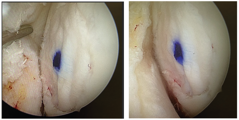 A purely arthroscopic procedure is of course always desirable and is also promoted by the individual suppliers as well as in lecture series. However, in our opinion there should be no compromise in the preparation of defects and cartilage treatment. The principle “quality wins over scar length” means that the procedure should be swiftly converted to a mini-open arthrotomy, if sufficient arthroscopic visualization cannot be achieved in a relatively short space of time. Ultimately, the surgery time is shorter in most cases and the outcome equivalent, if not better, compared to a pure arthroscopy procedure. (Fig. 10)