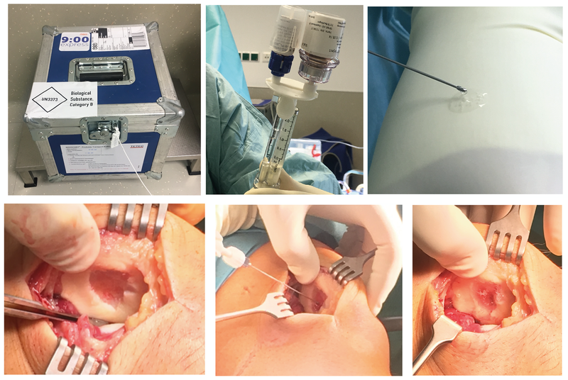 The produced cell mixture is then introduced into the defect and stabilised with fibrin glue (Fig 33). In addition, the product can be secured by a membrane against shear forces, as in the AMIC procedure and stabilized with fibrin glue or sutures. In the current trial phase further different combinations of the “minced” technique are being tested, although microfracture surgery or microdrilling may also be additionally performed.