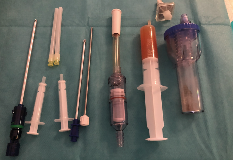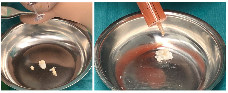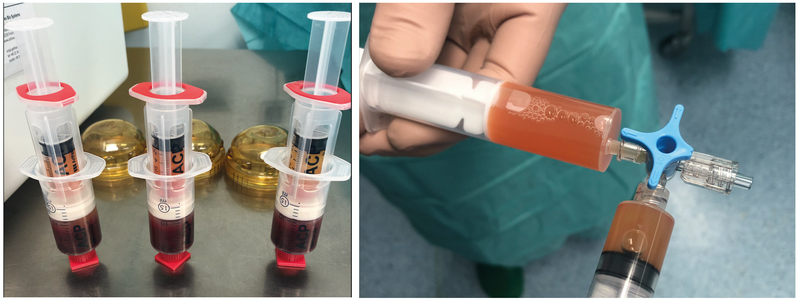 The harvested paste-like chondrocyte mass can be enriched with platelet rich plasma (PRP) or platelet rich fibrin (PRF) (Fig. 30), which is centrifuged from the patient’s whole blood during the surgery (Fig. series 31).