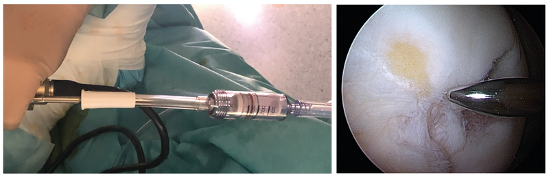 The chondrocyte implant is implanted in a second procedure according to the matrix used. When using gel-like matrix or spheroids, the substrate can usually be reinserted by arthroscopy without problems. Draining of the arthroscopy water is usually sufficient for defects in the femorotibial area. In case of poorly accessible defects (dorsal condyles/retropatellar) the option of using CO2 gas from general surgery can be considered to better visualize the defect. The matrix forms a gel within a few minutes, has a moderate haemostatic effect and remains within the defect after moving the joint through its full range. Performing the necessary defect debridement during the first stage has proven successful, because further extensive manipulation of the base of the defect can result in increased subchondral haemorrhage and poorer view. If inferior subchondral bone has to be constructed, then this is augmented prior to the M-ACT implantation by autologous spongiosa or corticospongious chips. The chondrocyte implantation can of course also be per-formed via a mini-open arthrotomy. The application sequence is identical (Fig. series 27).