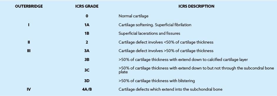 The indication for the treatment of deep-seated defined cartilage defects in combination with realignment osteotomies follows the guidelines of the respective expert associations. The main criteria are the depth of the damage and extent of the size of the defect based on the ICRS classifi-cation (Fig 2).