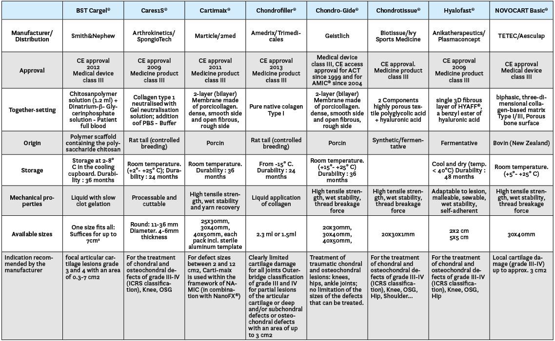 For larger defects from around 2.5 cm2 matrix-associated autologous chondrocyte transplantation (M-ACT) is a tried and tested procedure with comprehensive, good study data, which provides histologically hyaline-like cartilage replacement tissue. However, it causes higher logistical effort and high costs, requires also a two-stage treatment principle and is not generally available.