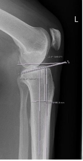 With a medial open-wedge correction of the tibia, the MPTA angle should be no more than 94° after the correction, because otherwise the joint line obliquity (JLO) is more than plus 4°, which results in clinically relevant shear forces in the joint and to poorer clinical outcomes.