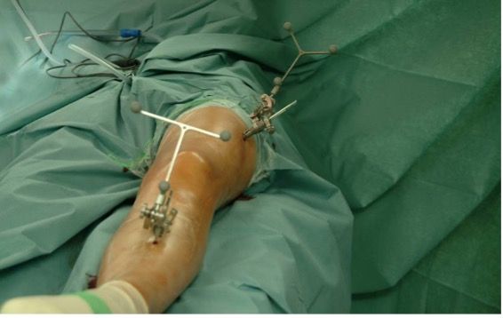 Before disinfection we label the centre of the femoral head and the centre of the ankle joint with the image intensifier (knee in neutral rotation and patella in the centre), draw the Mikulicz line on the knee with a rod and compare it with the preoperatively obtained whole leg radiograph. The whole leg is disinfected including the iliac crest (so that bone can be harvested later if necessary). For complex corrections we use computer-assisted navigation, which we would apply after the arthroscopy (Fig. 2).
