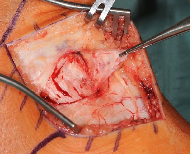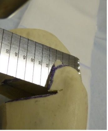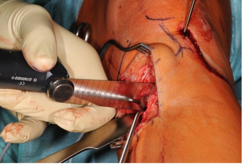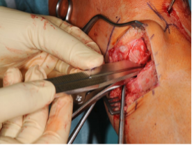 Insufficient release also has the consequence that the osteotomy opens less well on the dorsal side than on the ventral side, which will increase the slope. Thereafter, the periosteum is detached to the dorsal side with the angled periosteal elevator. Then a blunt Hohmann retractor is inserted on the dorsal tibia edge along the osteotomy site to protect the popliteal artery/vein and the tibial nerve.