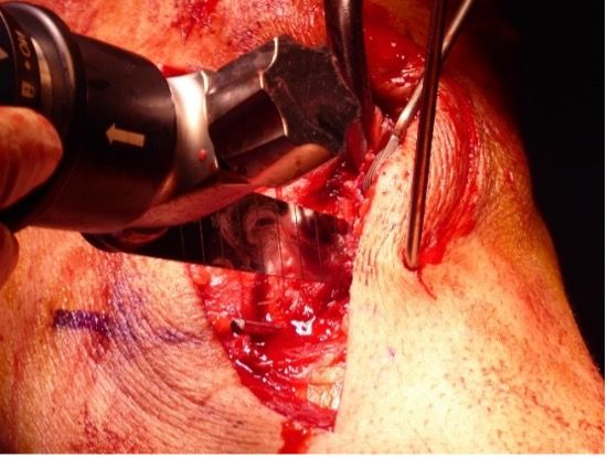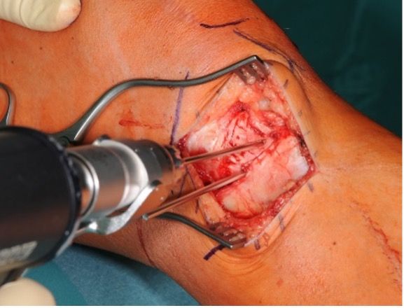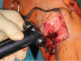 The surgery is performed in the supine position either under general or spinal anaesthesia. We administer tranexamic acid systemically and topically [19].