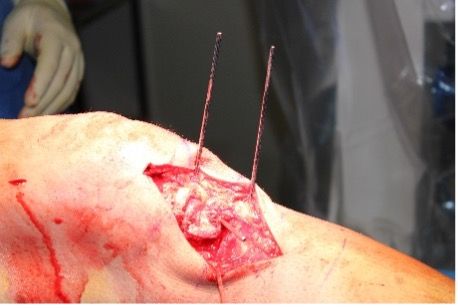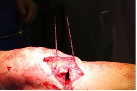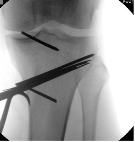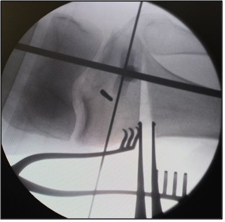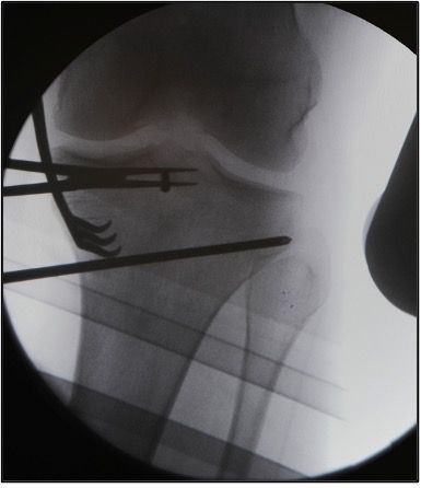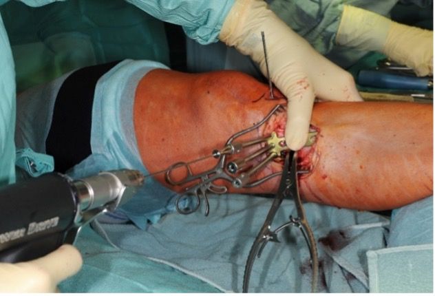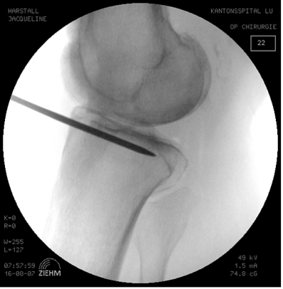 A first K-wire (3.0) is inserted under image intensifier monitoring from the dorsal superior margin of the pes anserinus to the superior margin of the tibiofibular joint. In order to be able to expose the tibiofibular joint, the knee is brought to 30° IR. The intraosseous length of the K-wire is measured at the same time.