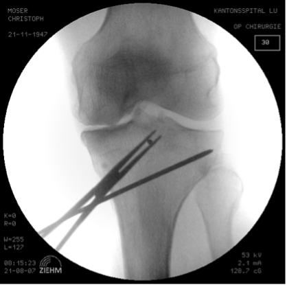 Full knee extension is the second objective of the correction. A spontaneous improvement of the extension can sometimes already be seen during surgery after correction of the varus angle and complete release of the superficial medial collateral ligament On the other hand, the tibial slope can be reduced by 3−6° if there is any extension deficit; technically, the distractor must be fitted on the posterior edge. With the two anterior K-wires the slope change is easily visible and is then checked in the lateral image intensifier image with the long rod (attached laterally). In case of ACL insufficiency we also reduce the slope. However, we generally perform a simultaneous ACL plasty in osteotomies with concomitant ACL insufficiency.