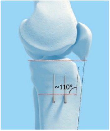 Planning with calculation of the correction angle was performed according to Miniaci [18] (Fig. 1e). Planning can be performed either manually or using digital software. It is important when planning the bone correction angle that an abnormal joint line convergence angle (JLCA) (see Fig. 1b) is included in the planning (alpha angle minus JLCA >2°) because otherwise the osteotomy will result in an overcorrection to valgus deformity.