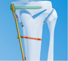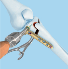 Now a tension screw is placed in combi hole 1 (below the osteotomy). On the one hand it can effect repositioning in case of distal tibia shift due to an instable lateral hinge, on the other hand this screw results in pretensioning of the plate with subsequent hinge compression (Fig. 8d).