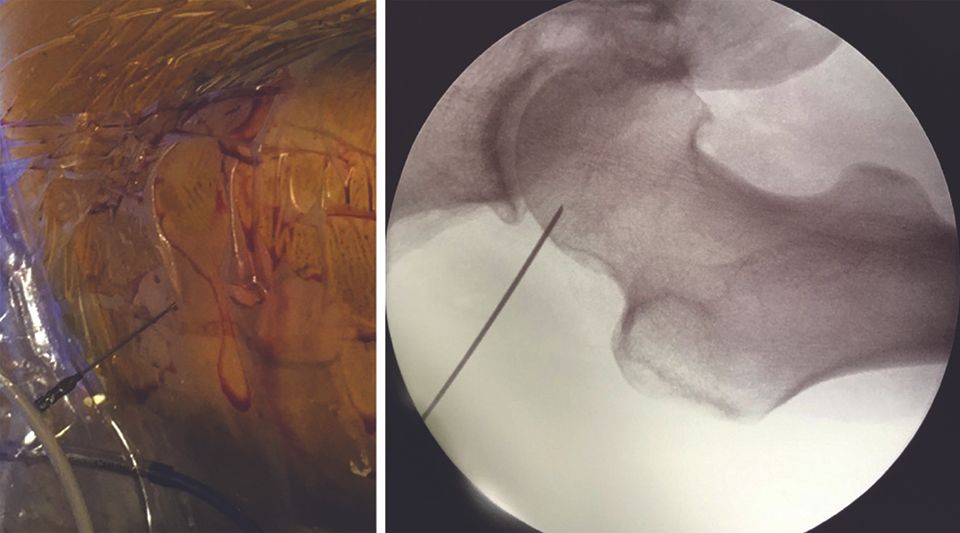 The needle is introduced, guided by the image intensifier, perpendicular to the superior part of the junction between the femoral head and neck (Fig. 13, right). Making small movements, the needle is used to probe along the lateral part of this junction to position it in the space between the anterior capsule and the anterior part of the junction between the femoral head and neck. Next, the nitinol guide is introduced, followed by the trocar for inserting the arthroscope.