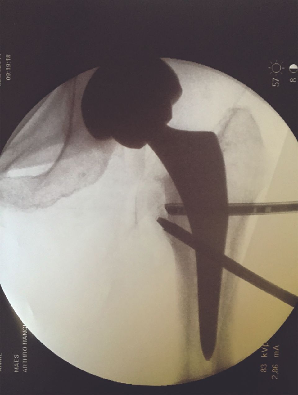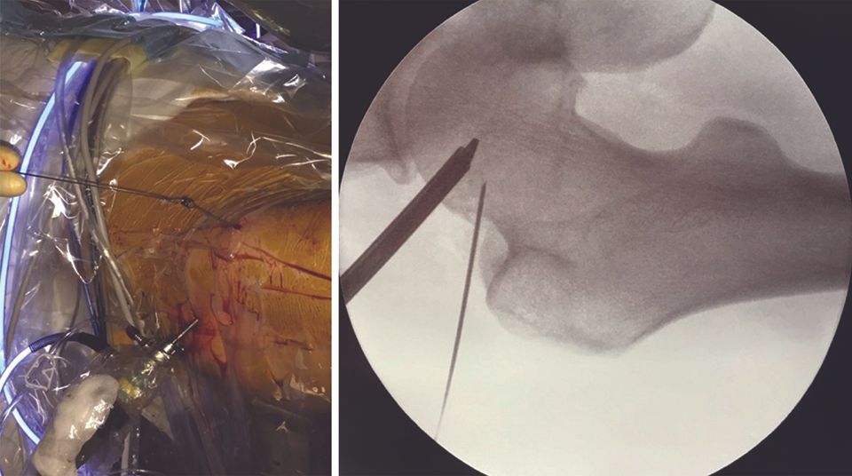 The image intensifier, used on a pulsing setting to reduce irradiation exposure, allows optimal portal creation and reduces the risk of iatrogenic damage to the labrum and cartilage.