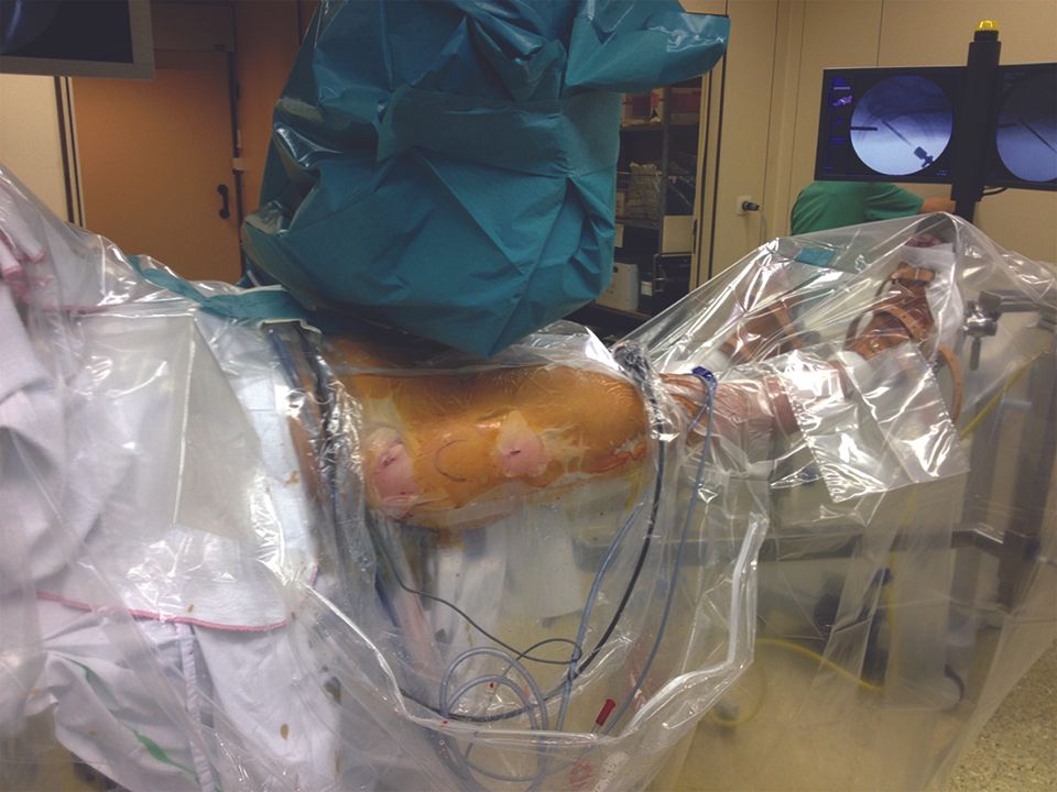 Most surgeons prefer to set up the patient in the dorsal decubitus position on an orthopaedic table (32,33).