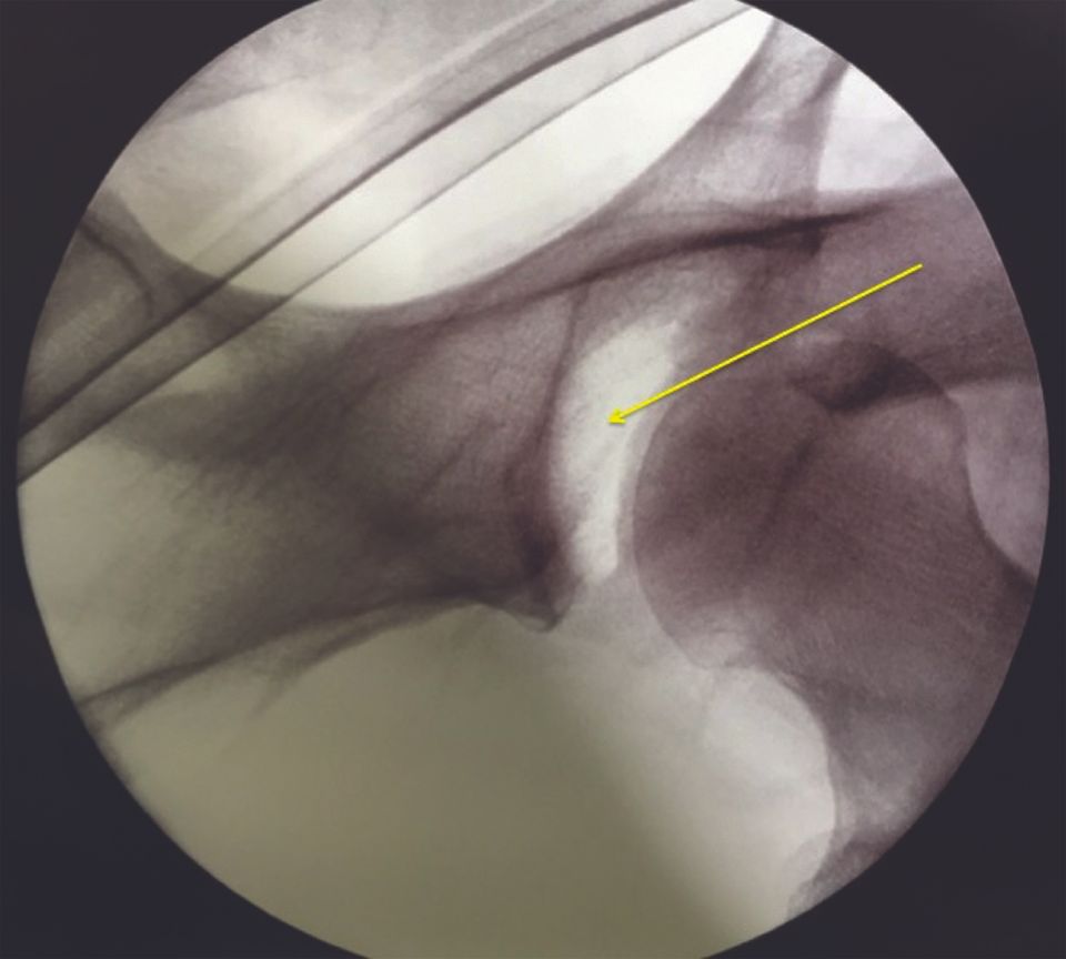 To avoid damaging the labrum and cartilage of the femoral head, the needle is pressed gently to observe the depression of the articular capsule before perforating it; this predicts the point of penetration of the anterior articular capsule.
