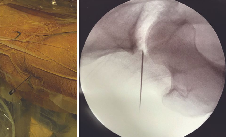 In my experience, the first point of entry is often situated mid-way between the ASIS and the apex of the greater trochanter (Fig. 13, left).