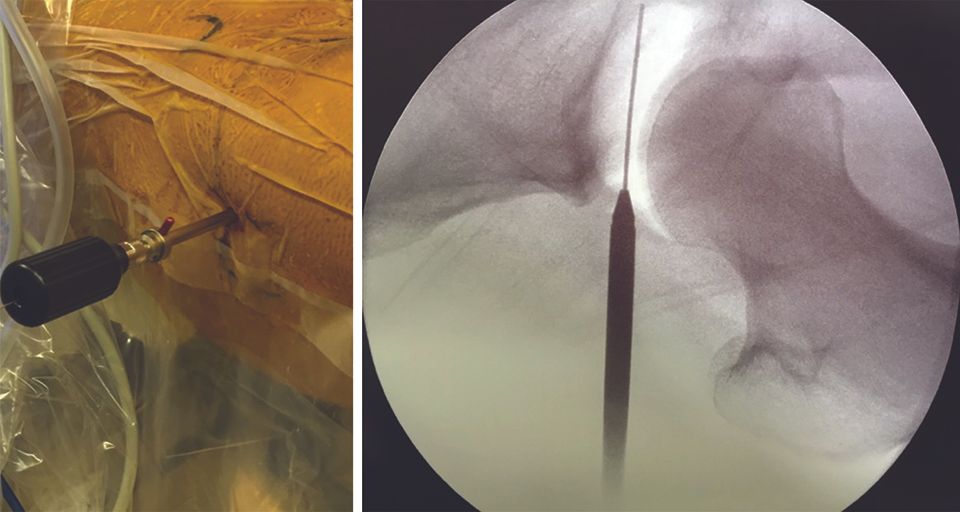 The second portal, created using the image intensifier and the arthroscope, is the anterior portal. The 17-gauge needle arrives into the triangular zone between the labrum and the femoral head (Fig. 7, right). This second portal allows the insertion of different instruments such as the spacer and electric lancet.