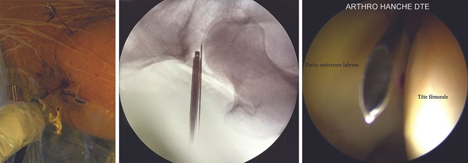 The entry point in the skin is situated beside the intersection of the ASIS–patella line and the perpendicular line that passes over the apex of the greater trochanter, either over or slightly distal to it (Fig. 7, left). The needle is inserted obliquely, approximately 45° superiorly and 30° posteriorly, guided at first by the image intensifier (Fig. 7, centre) and subsequently by the arthroscope, to arrive in the triangular zone formed by the labrum and the femoral head (Fig. 7, right).