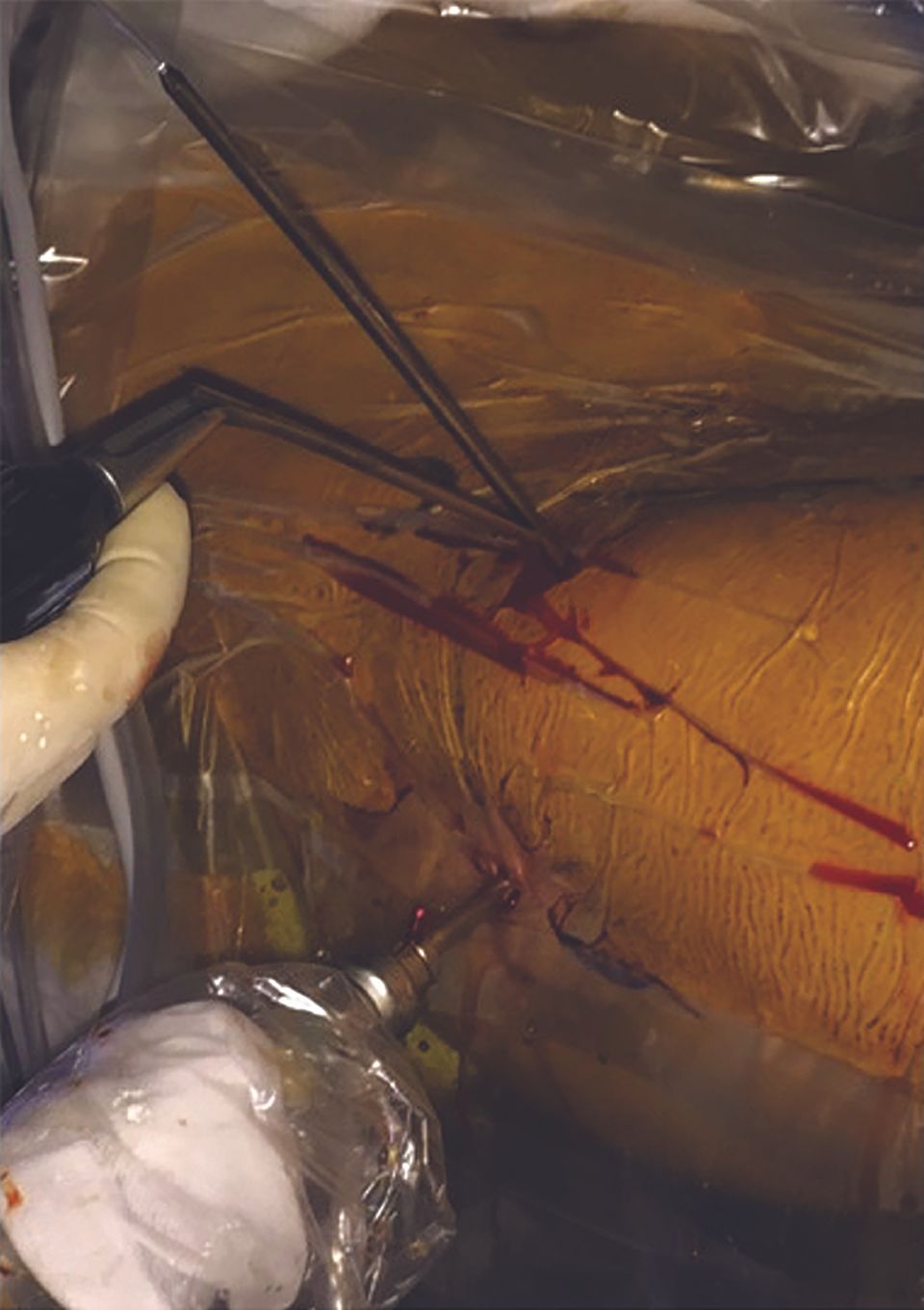 All the portals are created using an extra-long, hollow, 17-gauge spinal needle into which a fine metal (nitinol) guide is inserted. The trocar is introduced on this guide after withdrawing the hollow needle.