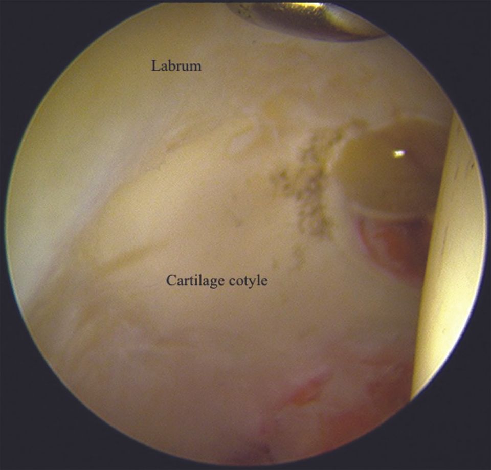 In the superior quadrant, the superior part of the labrum can be seen with the adjacent acetabulum cartilage and the brow of the acetabulum (Fig. 9).