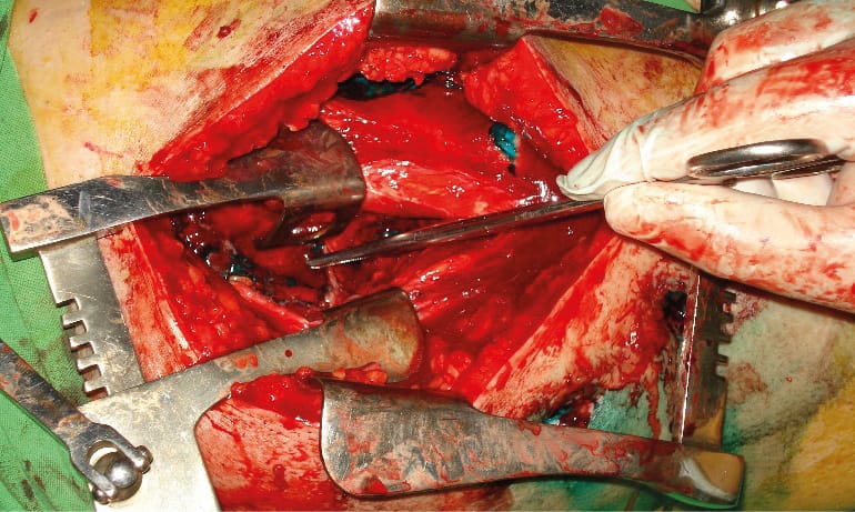 The subcutaneous fat tissue was separated and the fascia lata of the thigh was exposed. A cavity stained with green dye was found in the area of the lateral surface of the thigh. The fistulous tract extended between the m. tensor fasciae latae and the tendinous part of the m. gluteus maximus to the posterior surface of the femur. A fascial incision was made at the junction of the gluteus maximus and the fascia lata, transitioning into the iliotibial tract directed toward the posterior surface of the femur (Figure 2 B). The limb was rotated inward. During wound revision, a fistulous tract was found, extending along the upper edge of the m. quadratus femoris to the lesser trochanter. The m. quadratus femoris was bluntly separated from its attachment to the femur, and the lesser trochanter was exposed in the wound (Figure 3).