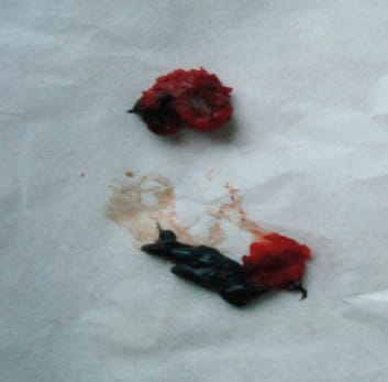 During revision, it was noted that the m. iliopsoas was completely separated from the lesser trochanter. The lesser trochanter lacked periosteum and felt rough to the touch. Surrounding it was a cavity filled with necrotic tissue stained with green dye. A resection of the lesser trochanter was performed. The specimen showed green dye penetrating inside the lesser trochanter (Figure 4).