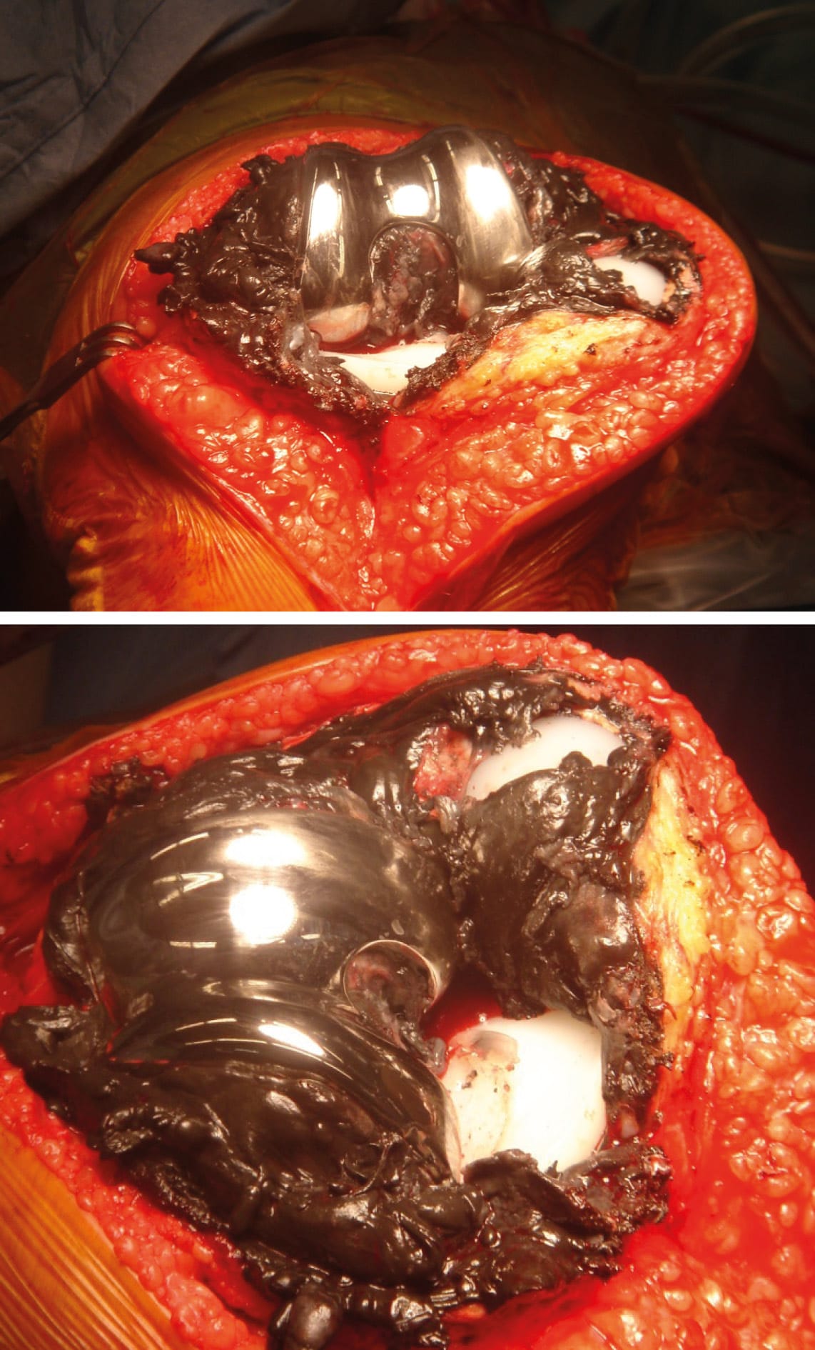 Beyond their direct impact on biomaterial wear, the release of debris, particularly cobalt ions, can lead to damage to surrounding cells and their DNA, theoretically increasing the risk of cancer, although some published series have not observed the appearance of malignant lesions after 19 years of follow-up [7] Lass R, Grübl A, Kolb A, Stelzeneder D, Pilger A, Kubista B, et al. Comparison of synovial fluid, urine, and serum ion levels in metal-on-metal total hip arthroplasty at a minimum follow-up of 18 years. J Orthop Res. sept 2014;32(9):1234-40. . Destruction of the vascular walls of endothelial cells can also be observed, thereby disrupting vascular distribution and promoting long-term tissue necrosis [8] Daley B, Doherty AT, Fairman B, Case CP. Wear debris from hip or knee replacements causes chromosomal damage in human cells in tissue culture. J Bone Joint Surg Br. mai 2004;86(4):598-606. . These alterations can, in the long term, lead to metallosis and pseudotumours [4] Mavrogenis AF, Nomikos GN, Sakellariou VI, Karaliotas GI, Kontovazenitis P, Papagelopoulos PJ. Wear debris pseudotumor following total knee arthroplasty: a case report. J Med Case Rep. 29 nov 2009;3:9304. , a prolonged inflammatory response [9] Gallo J, Goodman SB, Konttinen YT, Wimmer MA, Holinka M. Osteolysis around total knee arthroplasty: a review of pathogenetic mechanisms. Acta Biomater. sept 2013;9(9):8046-58. , hypersensitivity to metallic debris [10] Granchi D, Cenni E, Trisolino G, Giunti A, Baldini N. Sensitivity to implant materials in patients undergoing total hip replacement. J Biomed Mater Res B Appl Biomater. mai 2006;77(2):257-64. , not to mention the risk of infection, which is promoted by the presence of foreign bodies. Some authors have observed an abnormal increase in cellular necrosis around nickel implants [11] Wataha JC. Principles of biocompatibility for dental practitioners. Journal of Prosthetic Dentistry. 1 août 2001;86(2):203-9. . There was a positive correlation between the decrease in necrosis and the increase in distance from the implant, as necrosis decreased proportionally when the distance from the implant increased. According to Milosev, the rate of prosthesis loosening would be directly linked to the rate of peri-prosthetic necrosis [12] Miloŝev L, Antoliĉ V, Minoviĉ A, Cör A, Herman S, Pavlovcic V, et al. Extensive metallosis and necrosis in failed prostheses with cemented titanium-alloy stems and ceramic heads. J Bone Joint Surg Br. avr 2000;82(3):352-7. . Metallosis therefore corresponds to the process by which periprosthetic tissues acquire a greyish/blackish discolouration due to prolonged and significant exposure to a foreign body (the implant itself or its associated debris). This exposure generates a significant inflammatory response. This metallosis is primarily linked to debris present in the prosthetic environment rather than that generated by the implants themselves [13] Kraft CN, Diedrich O, Burian B, Schmitt O, Wimmer MA. Microvascular response of striated muscle to metal debris. A comparative in vivo study with titanium and stainless steel. J Bone Joint Surg Br. janv 2003;85(1):133-41. (Figures 4 and 5).