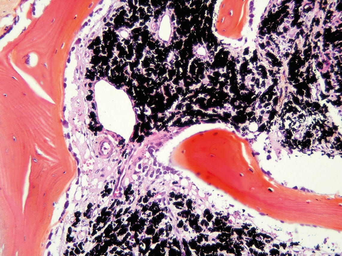 The release of metallic debris is insidious as it is often asymptomatic. However, the associated complications are very real. They are linked to two types of particles or debris: particles ranging in size from nanometres to millimetres, and soluble (or ionic) debris [1] Hallab NJ, Jacobs JJ. Biologic effects of implant debris. Bull NYU Hosp Jt Dis. 2009;67(2):182-8. . Small particles (less than 150 nm) can be incorporated by neighbouring cells (endocytosis) and then digested [2], Shanbhag AS, Jacobs JJ, Black J, Galante JO, Glant TT. Human monocyte response to particulate biomaterials generated in vivo and in vitro. J Orthop Res. sept 1995;13(5):792-801. [3] Shanbhag AS, Macaulay W, Stefanovic-Racic M, Rubash HE. Nitric oxide release by macrophages in response to particulate wear debris. J Biomed Mater Res. 5 sept 1998;41(3):497-503. . Larger debris (up to 10 µm) can be phagocytosed by osteoblasts, fibroblasts, endothelial cells, and macrophages [1] Hallab NJ, Jacobs JJ. Biologic effects of implant debris. Bull NYU Hosp Jt Dis. 2009;67(2):182-8. . However, this elimination is only partial; the body only manages to eliminate a fraction of the metallic debris. The rest accumulates around the joint to form larger residues that are difficult, if not impossible, to eliminate. Numerous studies report high concentrations of polyethylene debris, titanium/aluminium/vanadium alloy debris, and chromium/cobalt/molybdenum debris in the peri-prosthetic environment during revision arthroplasty procedures [4], Mavrogenis AF, Nomikos GN, Sakellariou VI, Karaliotas GI, Kontovazenitis P, Papagelopoulos PJ. Wear debris pseudotumor following total knee arthroplasty: a case report. J Med Case Rep. 29 nov 2009;3:9304. [5] Delaunay C, Petit I, Learmonth ID, Oger P, Vendittoli PA. Metal-on-metal bearings total hip arthroplasty: the cobalt and chromium ions release concern. Orthop Traumatol Surg Res. déc 2010;96(8):894-904. . This metallic debris can also cross vascular walls and concentrate in certain organs (liver, lungs, kidneys, bone marrow, brain) [6] Case CP, Langkamer VG, James C, Palmer MR, Kemp AJ, Heap PF, et al. Widespread dissemination of metal debris from implants. J Bone Joint Surg Br. sept 1994;76(5):701-12. .
