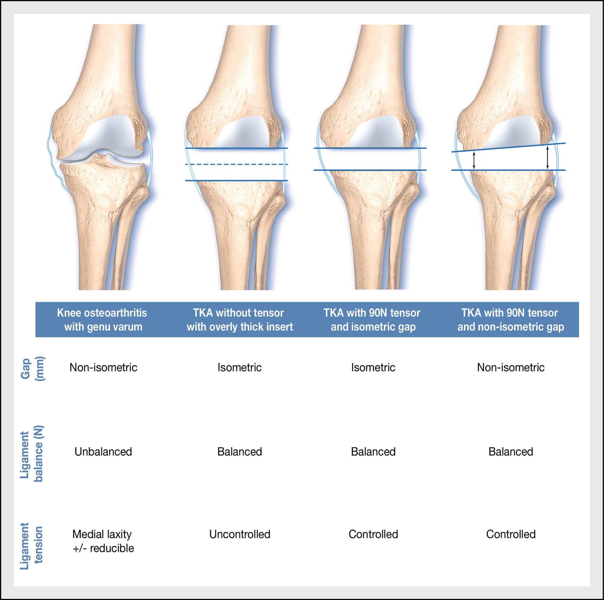 In practice, we can define different situations based on the concepts of isometric or non-isometric gaps, controlled or uncontrolled tension, and ligament balancing (Table 1).