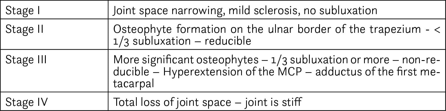 It is divided into four stages. The first stage consists of mild sclerosis. In the second, there is subluxation with the first metacarpal shifting by less than one third of the base and osteophyte formation at the ulnar border, although this is all said to be reducible. In stage 3 subluxation exceeds one third of the thumb base, there is increased osteophyte formation, and hyperextension of the metacarpophalangeal (MCP) joint of the thumb will result if the metacarpal head shape allows. Stage 4 involves almost total immobility due to the joint degeneration.