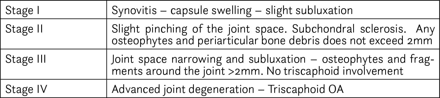 This last classification is the most complete. It looks at the extent of TMC joint degeneration, primary instability and triscaphoid involvement.