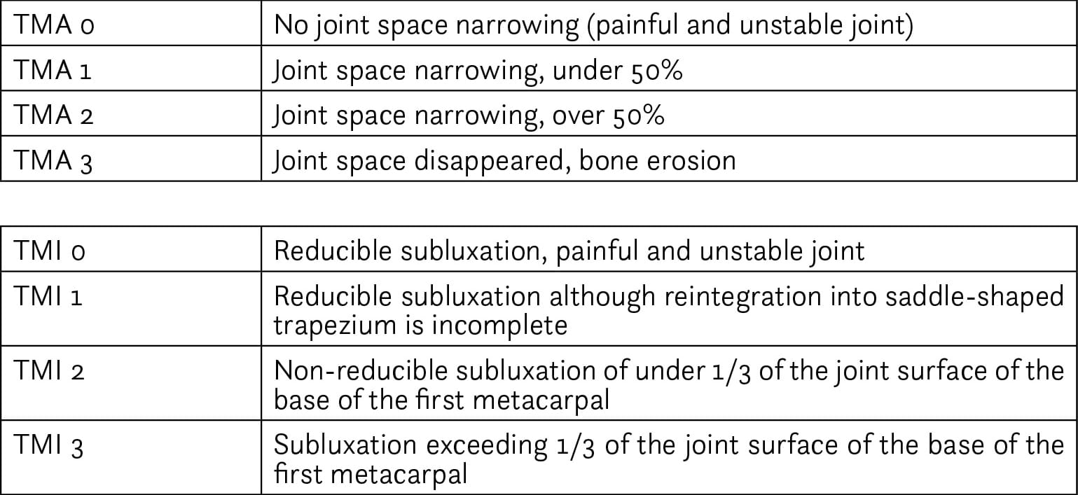 It grades TMA (trapeziometacarpal osteoarthritis) – joint space involvement – from 0 to 3 starting from a preserved joint space (TMA 0), joint space narrowing under 50% (TMA 1), joint space narrowing over 50% (TMA 2) and finally disappearance of the joint space (TMA 3). TMI (trapeziometacarpal instability) looks at the extent of instability, with TMI 0 being reducible subluxation at the base of the first metacarpal, and TMI 1 also being reducible subluxation although the first metacarpal does not fully reintegrate into the saddle-shaped trapezium. At TMI 2 subluxation is no longer reducible but affects less than 1/3 of the joint surface. At TMI 3, subluxation of the first metacarpal exceeds 1/3 of the base.