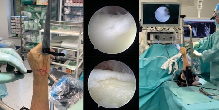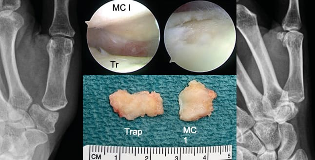 An arthroscopy offers improved assessment of damage if conventional radiology is not conclusive. It replaces CT arthrogram and provides a better insight into the variability (Figure 15) of cartilage involvement at the trapezium and the articulating surface of the first metacarpal.