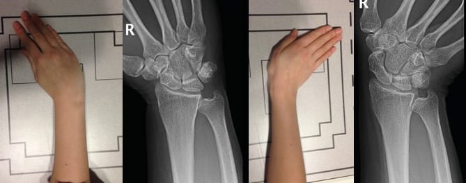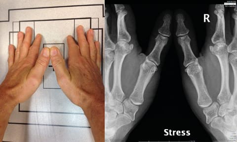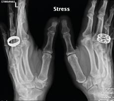Eaton’s views are the same as Kapandji’s frontal view, except that in the Eaton series the images are comparative (Figure 4), which means that a stress view (Figure 5) is taken so that the joint space can be assessed for any collapse when put under stress.