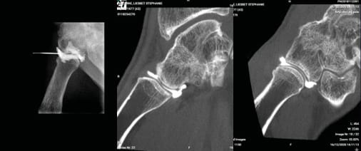 If there is any uncertainty, a CT scan will be carried out, preferably CBCT (3) as it offers greater detail and delivers lower radiation with contrast (Figure 14). This will allow an evaluation of cartilage quality. A trapeziometacarpal arthroscopy is better still (Figure 15).