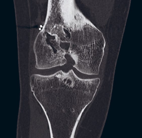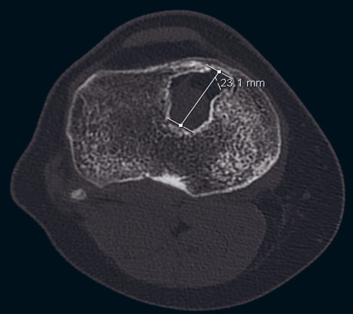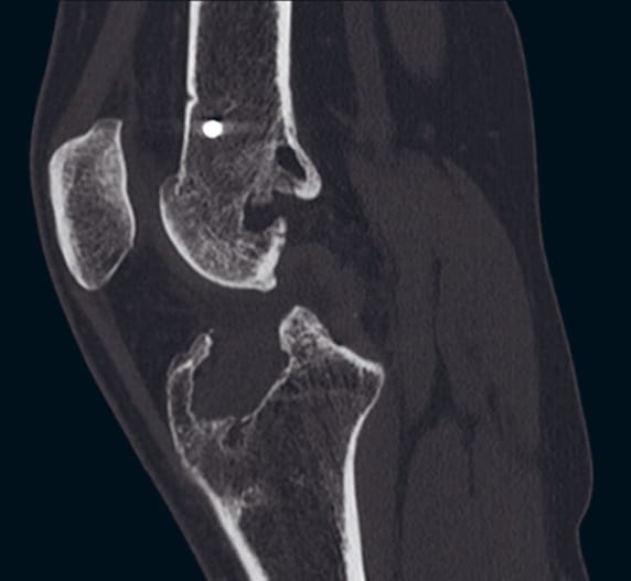 Furthermore, additional surgery could also be required during the revision ACLR procedure, and must be planned for prior to surgery. If necessary, the surgeon should have a pre-operative plan for collateral reconstruction or for osteotomy in the case of a varus knee with posterolateral instability or medial OA[8], Harner CD, Giffin, J, Robert M.D, Dunteman, Roger C. ; Annunziata, CC, Friedman MJ. Evaluation and Treatment of Recurrent Instability After Anterior Cruciate Ligament Reconstruction. J Bone Jt Surg. 2000;82(11):1652.[9], Noyes FR, Barber-westin SD, Hewett TE. High Tibial Osteotomy and Ligament Reconstruction for Varus Angulated Anterior Cruciate Ligament-Deficient Knees *. 2000;28(3):282-296.[10] Arthur A, Laprade RF, Agel J. as the Initial Treatment for Chronic Posterolateral Corner Deficiency in the Varus Knee A Prospective Clinical Study. 2007:1844-1850. . In this case report, the patient had previously undergone three ACLRs (including one two-stage procedure). Due to the recurrent tibial tunnel expansion, we re-grafted the tibia. However, pre-operative CT scan showed a persistent, grossly enlarged tibial tunnel so we elected to use a laterally based tibial tunnel. In addition, we performed a lateral extra-articular ITB tenodesis due to the high-risk nature of the patient’s multiple failed grafts without additional correctible factors such as malalignment, collateral laxity or increased posterior tibial slope[11] Ferretti A, Conteduca F, Monaco E, Carli A, D’Arrigo C. Revision Anterior Cruciate Ligament Reconstruction with Doubled Semitendinosus and Gracilis Tendons and Lateral. J Bone Jt Surg. 2006;88(11):2373-2379..