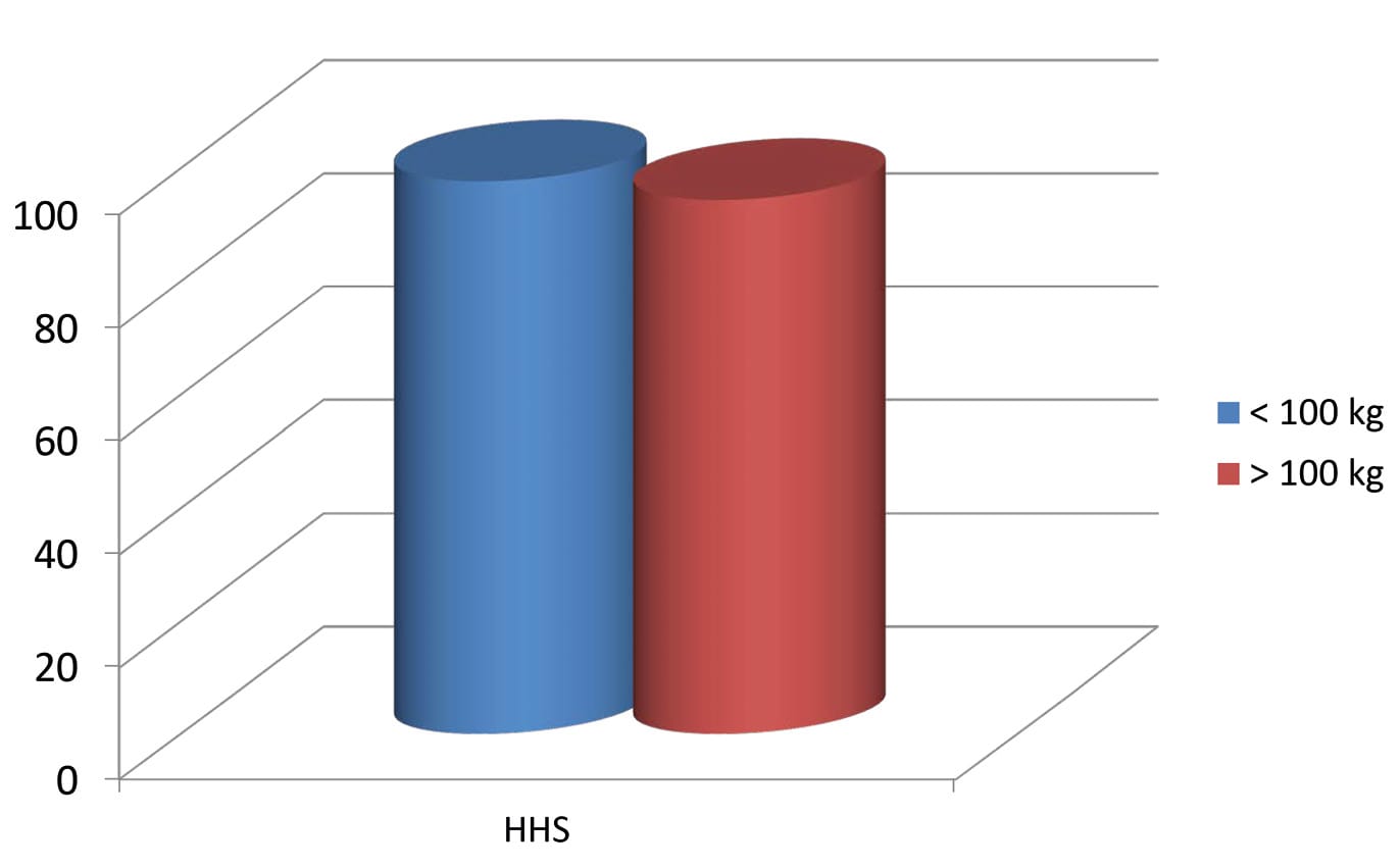The measured difference in the Harris Hip Score is very little and due to the general restrictions by obesity (Figure 5). In another evaluation of this study group we divided 773 patients into weight classes of <100 and >100 kg. Again there were no significant differences to be seen. Pain at rest and under load was measured with the visual analogue scale. The heavy patients complained slightly more and were less satisfied achieving 94.4 points in the Harris Hip Score vs 97.7 points in the lighter group (Figure 6).