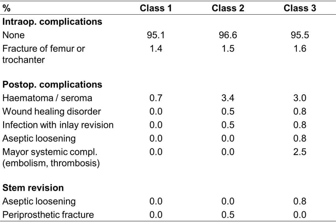 Our findings and those in literature suggest there is no evidence to withhold THA from obese patients with arthritic hips. The impact of complications and comorbidity is considerable. Of course it is a demanding operation and should be performed by high volume surgeons. Surgery is more difficult and of longer duration with the risk of malpositioning the components [4] Elson L.C. et al. Are morbidly obese patients undergoing THA at an increased risk for component malpositioning? The Journal of Arthroplasty 2013: 28:41-44. especially with minimally invasive techniques. The selected implant needs to have the ideal size and optimal pressfit. In order to prevent dislocation, enough offset and full-cup coverage is needed [3] Elkins J.M. et al. Morbid obesity may increase dislocation in total hip patients: A biomechanical analysis, Clin Orthop Relat Res 2013; 471:971-980. and on the acetabular side double mobility cups are more effective than big heads to reduce the risk of dislocation [8] Maisongrosse P. et al. Obesity is no longer a risk factor for dislocation after THA with a double-mobility cup. Int Orthop 2015 Jul;39(7):125-128.. In conclusion short stems seem to perform as well as standard stems. Further long term studies have to prove this statement.